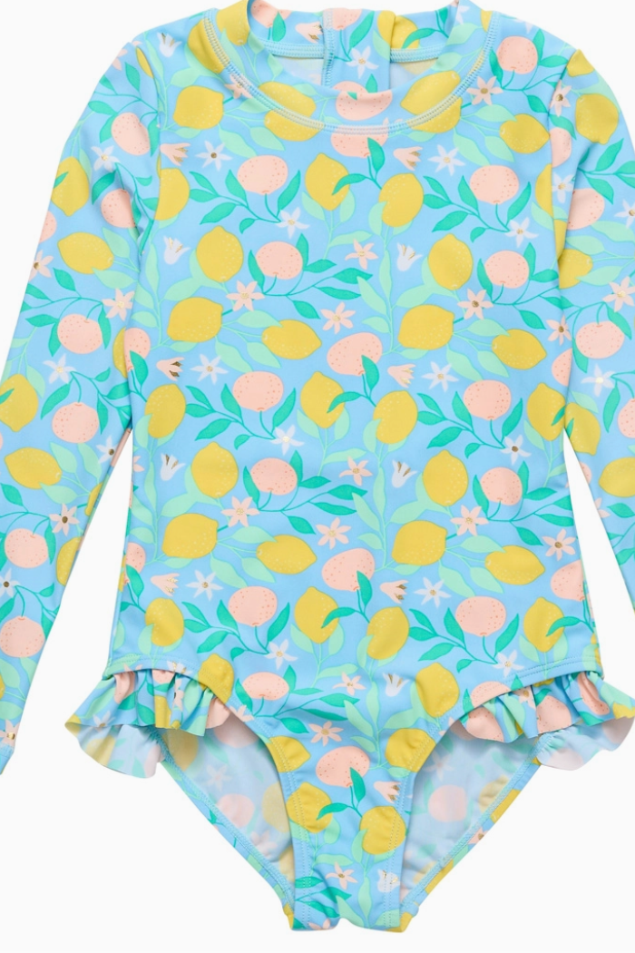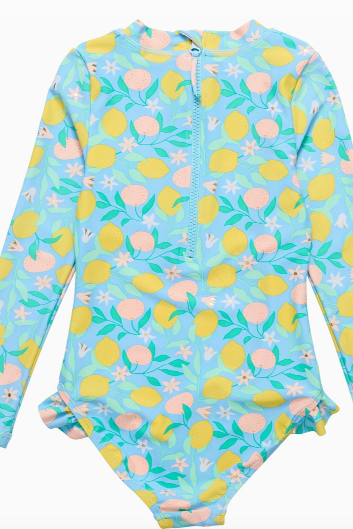 Combine surf with a little citrus and you've got our Lemon Drops collection, designed to protect your beach babe in UPF50+ fabric as she rides the waves. Boasting full upper-body coverage that's easy to zip up from the back, this long-sleeved surfsuit provides maximum comfort for days seaside. Leg frills on sizes 0-6 years only. No leg frills on sizes 8-12 years Fully lined