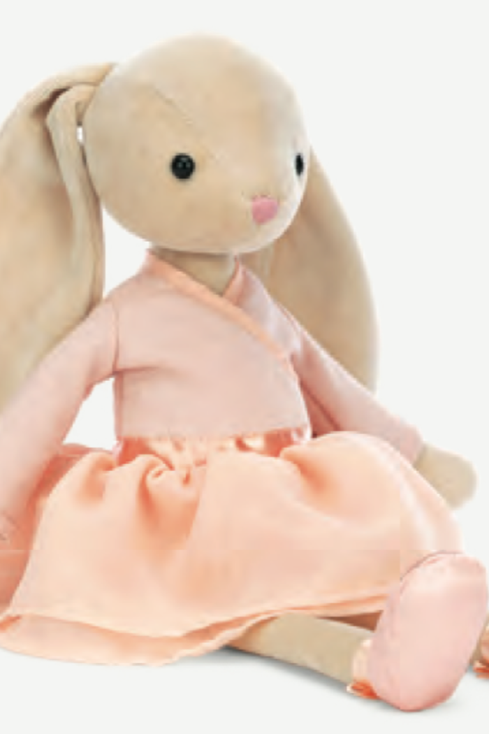 Lila Ballerina Bunny is warming up for her grand debut! In a peachy jersey crossover wrap, double-layered tutu and satin pointe shoes, Lila's sure to be a spinning success! Her favourite move is the grand jeté - leaping right across the stage with her long ears flying out behind her!