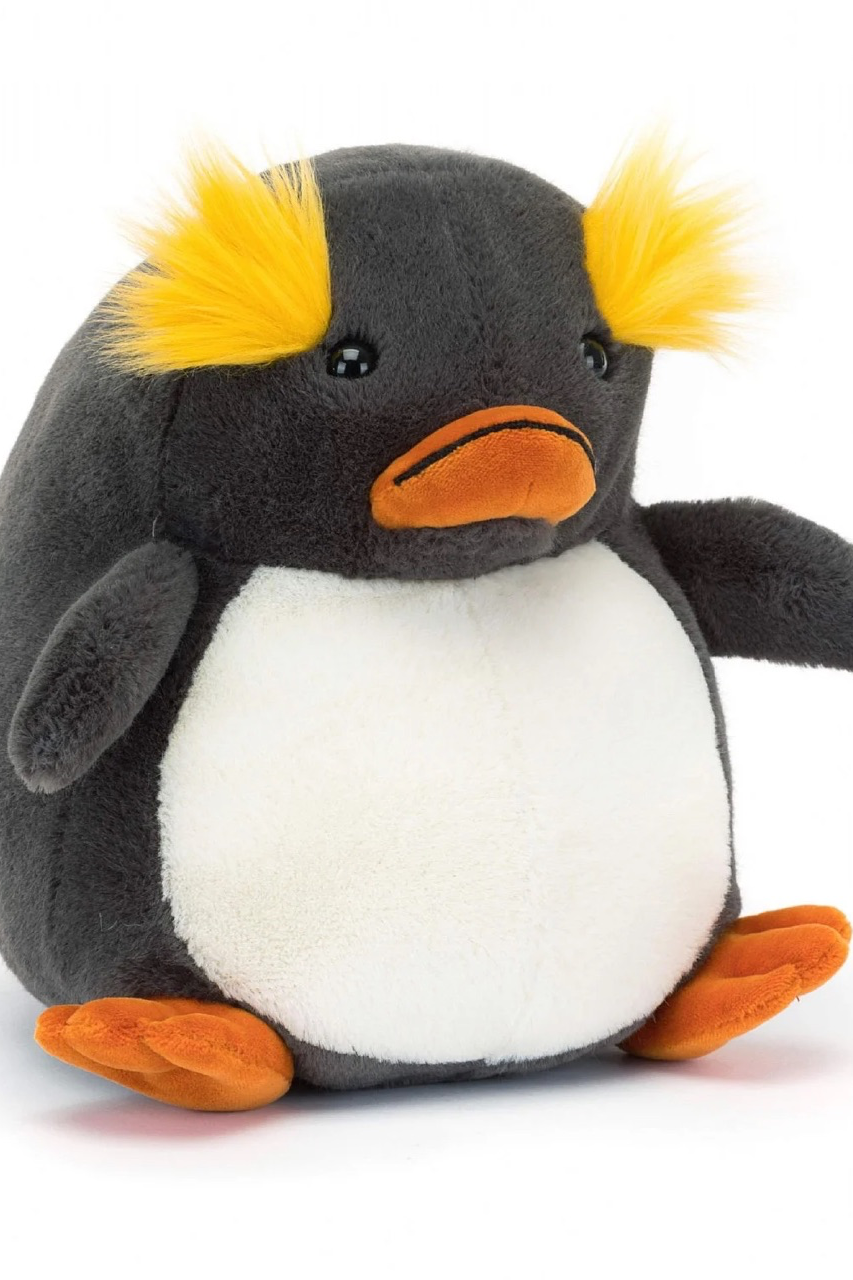 Maurice Macaroni is a blue-grey penguin, gorgeously squat with a round cream bib and custard-yellow tufts. With waggly flippers, stitch suedette feet and a down turned piped orange bill, Maurice is suitably serious!