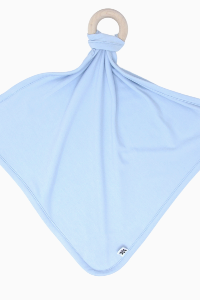 The perfect newborn gift! This beautiful keepsake is a 12 x 12 inch square piece with the softest double layer bamboo jersey and wooden ring for attaching pacifiers.
