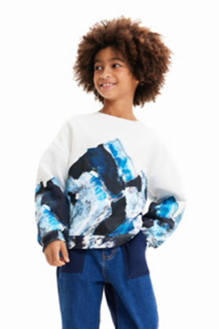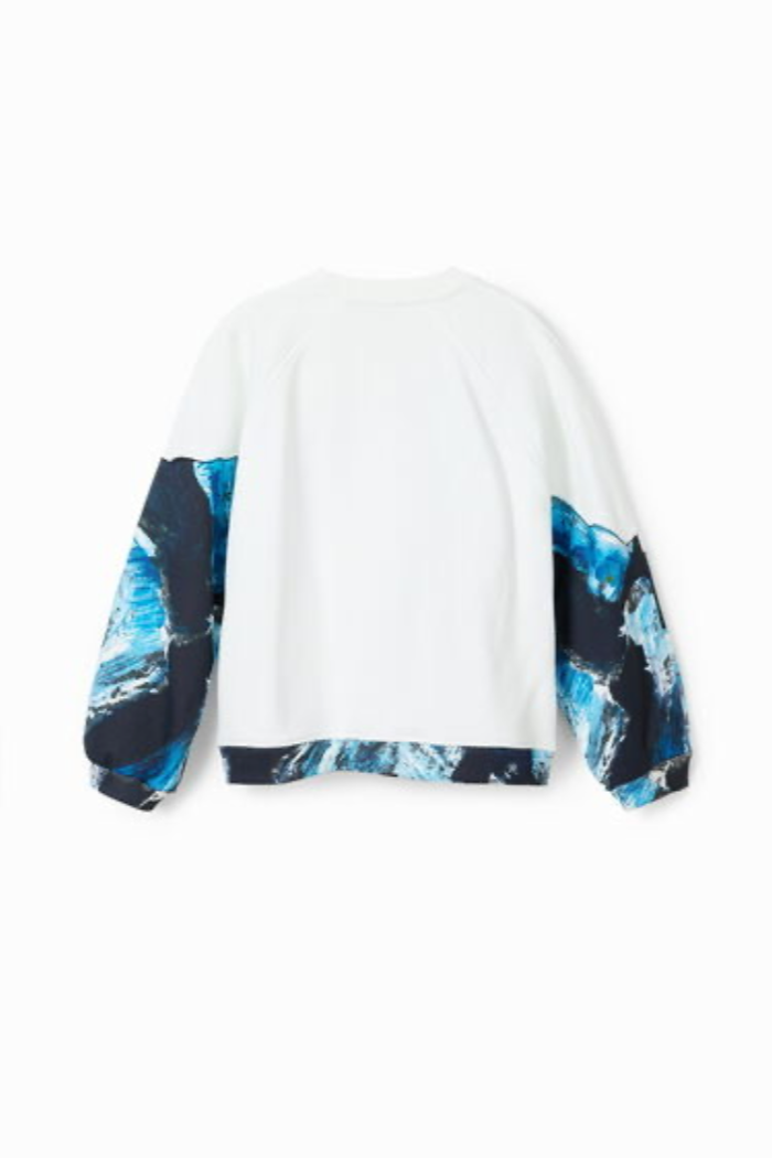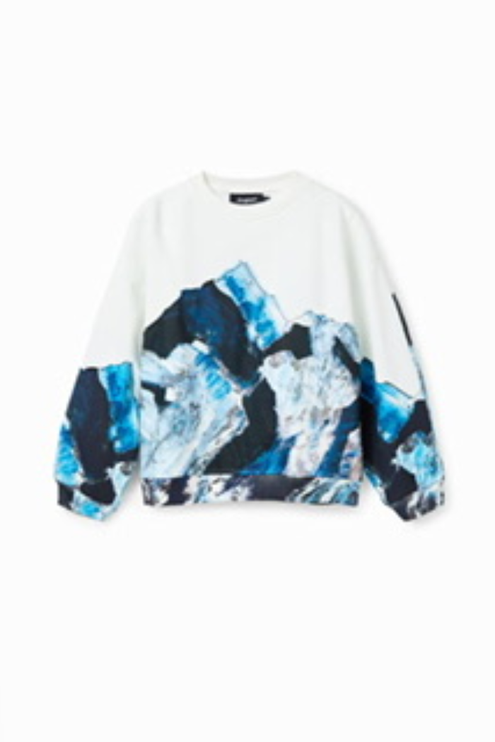 A loose crewneck sweatshirt with a paint-effect landscape print patch on the front and sleeves.