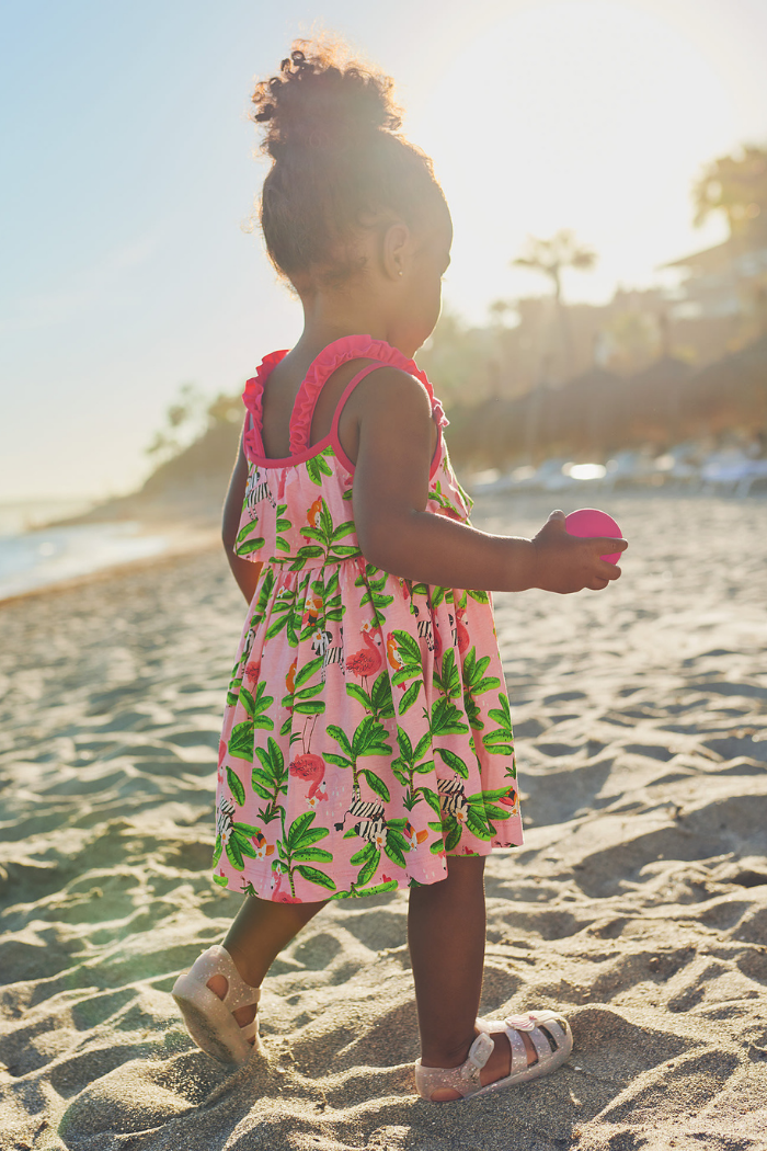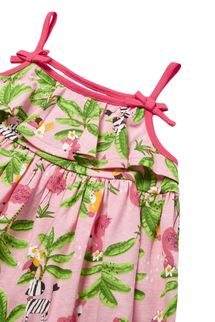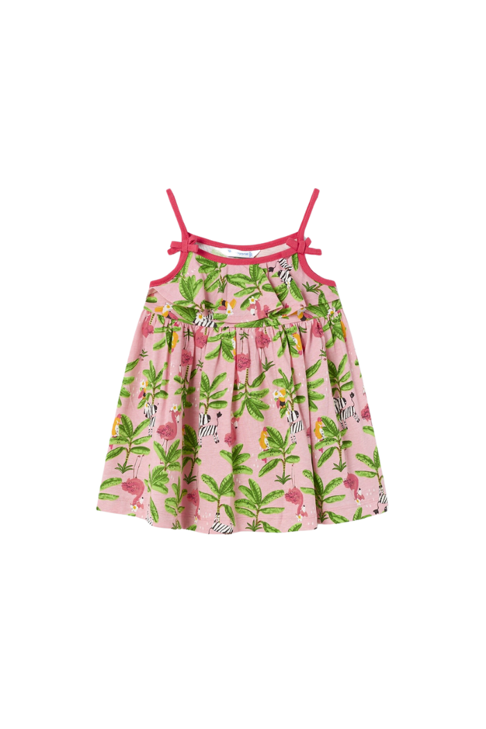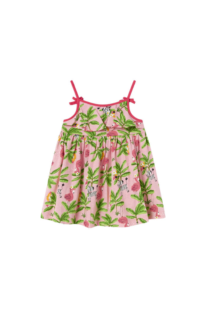 ECOFRIENDS garment 100% sustainable cotton. Strap dress for baby. Decorative elements: bow appliques, decorative ruffle. Patterned design.