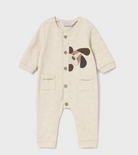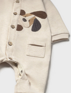 This long-sleeved one-piece is designed specifically for newborn baby boys, combining comfort and practicality. It features a round neckline for gentle wear and button fastenings down the front, making dressing and undressing straightforward. A button fastening at the crotch ensures a secure fit while facilitating diaper changes. The garment is adorned with charming embroidered puppy dog motifs on both the front and back, adding a delightful touch. Snaps extend from ankle to ankle, allowing for effortless diaper access without fully removing the outfit. Convertible feet provide the option to cover or uncover little toes as needed, adapting to your baby’s comfort and temperature. This versatile piece supports ease of use and cozy wear for your baby's delicate needs.
