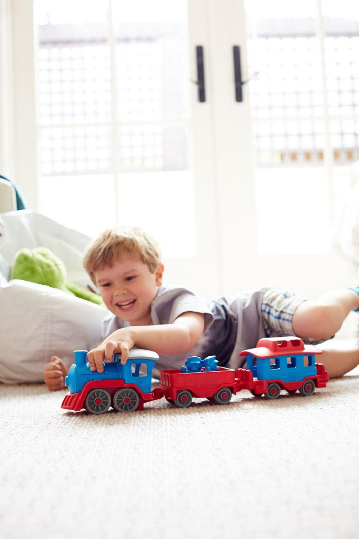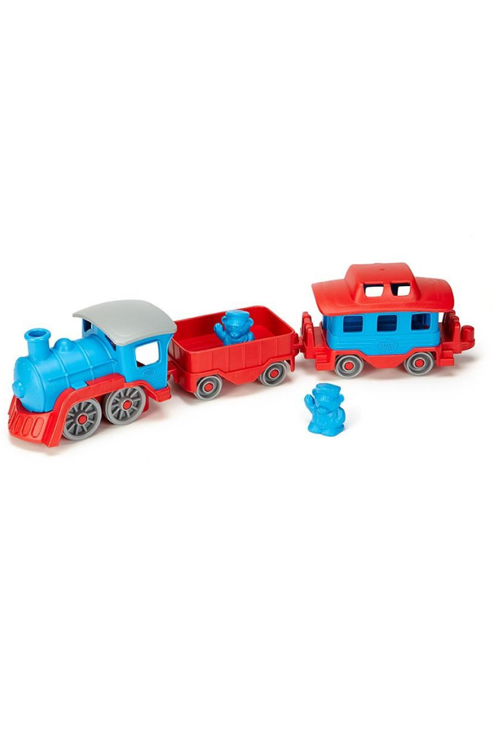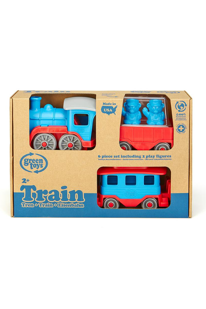 All aboard! The Green Toys Train is pulling out of the station! This sturdy locomotive is ready to chug along from one eco-friendly adventure to the next. Made in the USA from 100% recycled plastic milk jugs that save energy and reduce greenhouse gas emissions, the brightly-colored steam engine pulls two additional cars that link together to form a long train, or easily unhook for stand-alone play. The open wagon is perfect for hauling all kinds of sustainable cargo, while the caboose features a spacious interior and removable roof. Two conductor bear figures are included with the set, encouraging open play as little engineers' imaginations lay the tracks for all sorts of creative narratives. With no metal axles or external coatings, the Green Toys Train is safe and versatile for both indoor and outdoor play, and is dishwasher safe for easy cleaning.