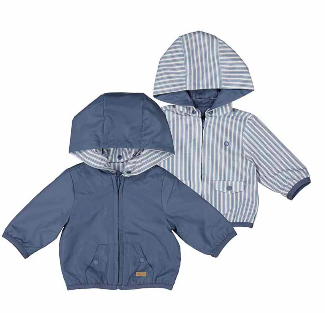 This versatile windbreaker offers two looks in one, perfect for any weather. With a removable hood and reversible design, you can easily switch up your style to match your mood. The solid blue side is ideal for a sleek, understated look, while the classic blue on blue stripe adds a fun pop of color. Perfect for any occasion, this windbreaker is a must-have for any wardrobe.