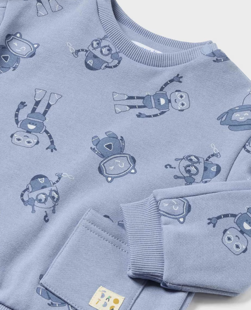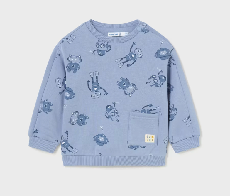 This adorable long-sleeve sweatshirt for babies features a button closure at the neck for easy adjustment. Designed with elastic knit at the hem, cuffs, and collar for a snug fit, it includes a functional front pocket and is beautifully adorned with a charming printed design. Perfect for keeping your little one comfortable and stylish!