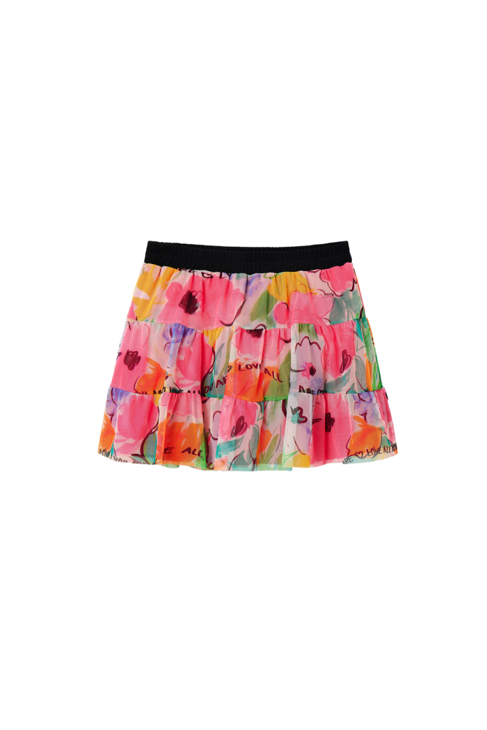 A tulle mini skirt with an elasticated waist, three flounce-effect ruffled panels and a floral print.
