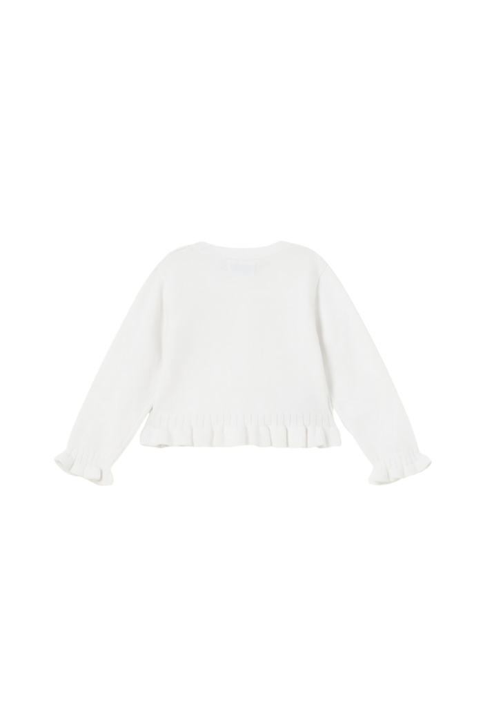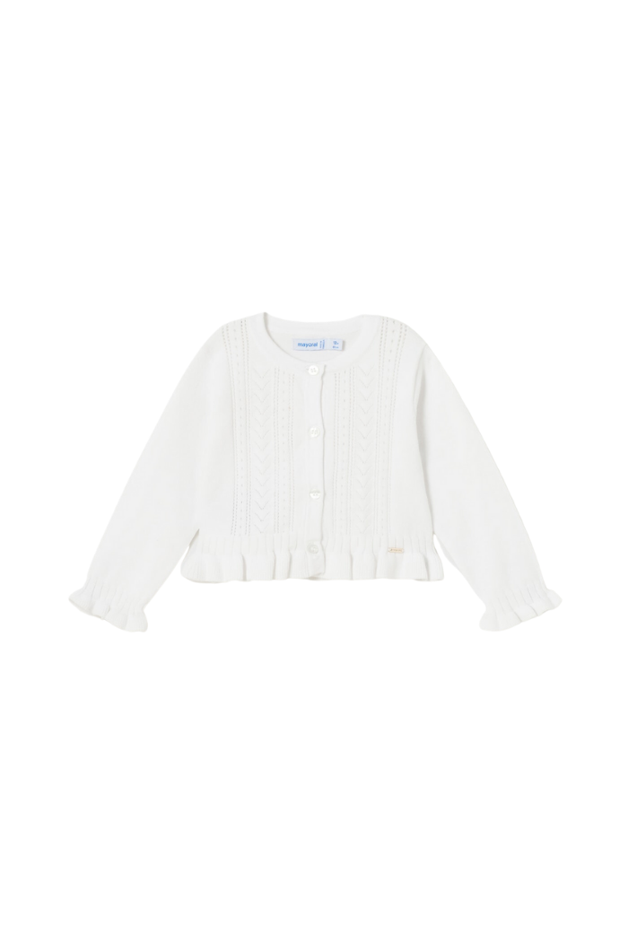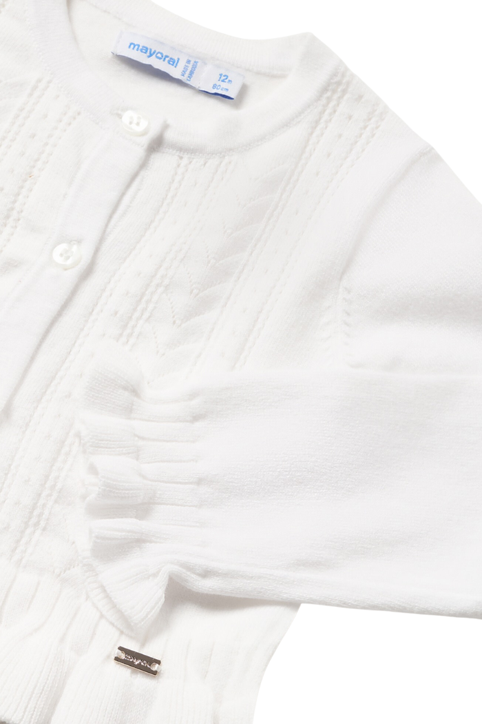 ECOFRIENDS garment, contains sustainable cotton. Long sleeved Cardigan for baby. Button fastenings down the front. Made using fine knit fabric that is soft to the touch. Decorative elements: openwork details, decorative ruffle.