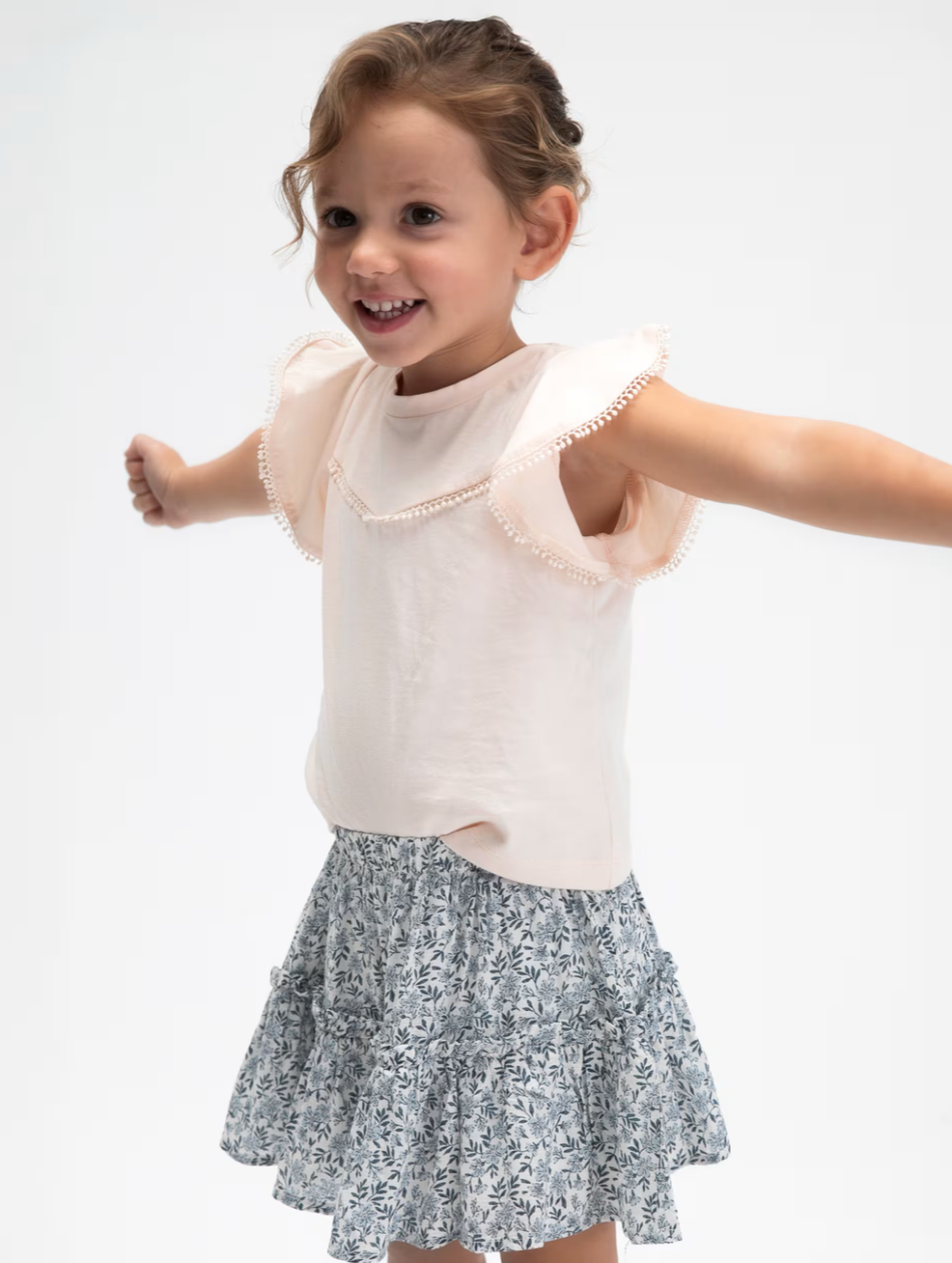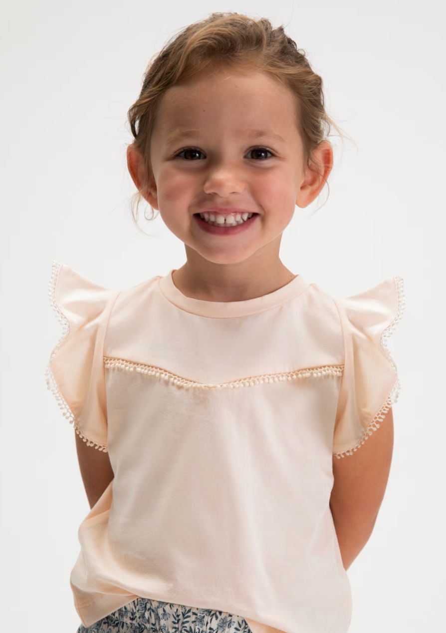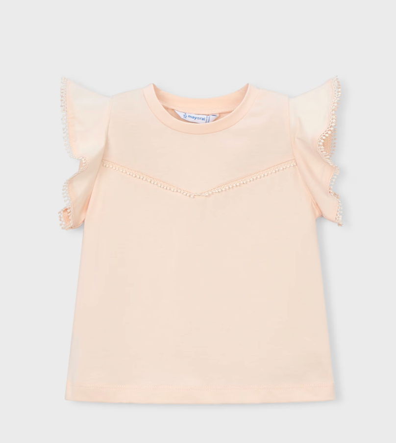 Elevate your casual wardrobe with this sophisticated salmon ruffled T-shirt, a versatile piece that seamlessly transitions from day to evening.