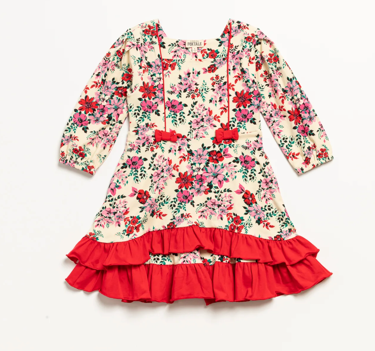 The Serenade Dress will have your gal feeling like she’s wearing an everyday dress while looking like she’s dressed for an elegant occasion! It’s packed with pretty details like the piping on the lined bodice, the double-layered skirt trimmed in rich poinsettia red ruffles, and blousy 2/3 sleeves. For the cherry on top, we finished this sweet silhouette with two tacked bows at the waist