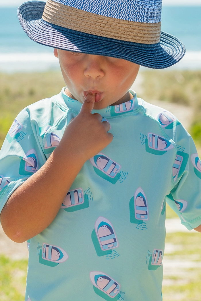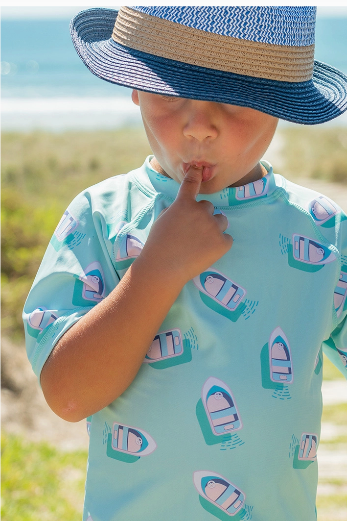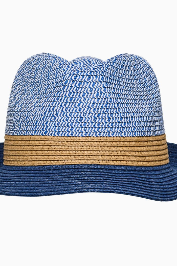 When your dapper dude dons this boys' sun hat, he'll be sure to turn heads. The fedora-style wide brim provides ample shade, keeping his face and neck protected from the sun, and the carefully crafted woven material brings nautical chic in several shades of blue. 100% Paper straw Size S/M fits 2-6 years, Size M/L = fits 6-12 years