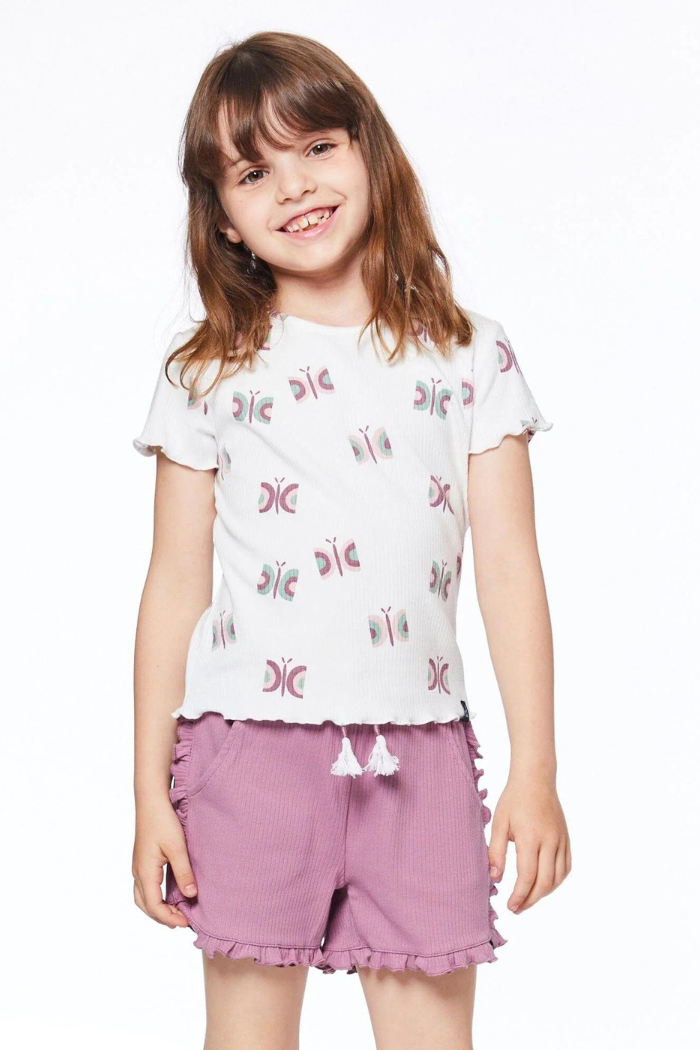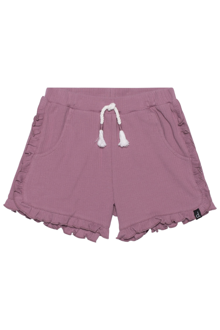 Our ruffle short is a must-have for the girl who likes her basics with a twist. This comfortable pull-on short is made from a stretch cotton/elastane blend and features an elastic waistband with a rope tassel tie, ruffles down each side and around the hem, and scoop pockets at each hip.