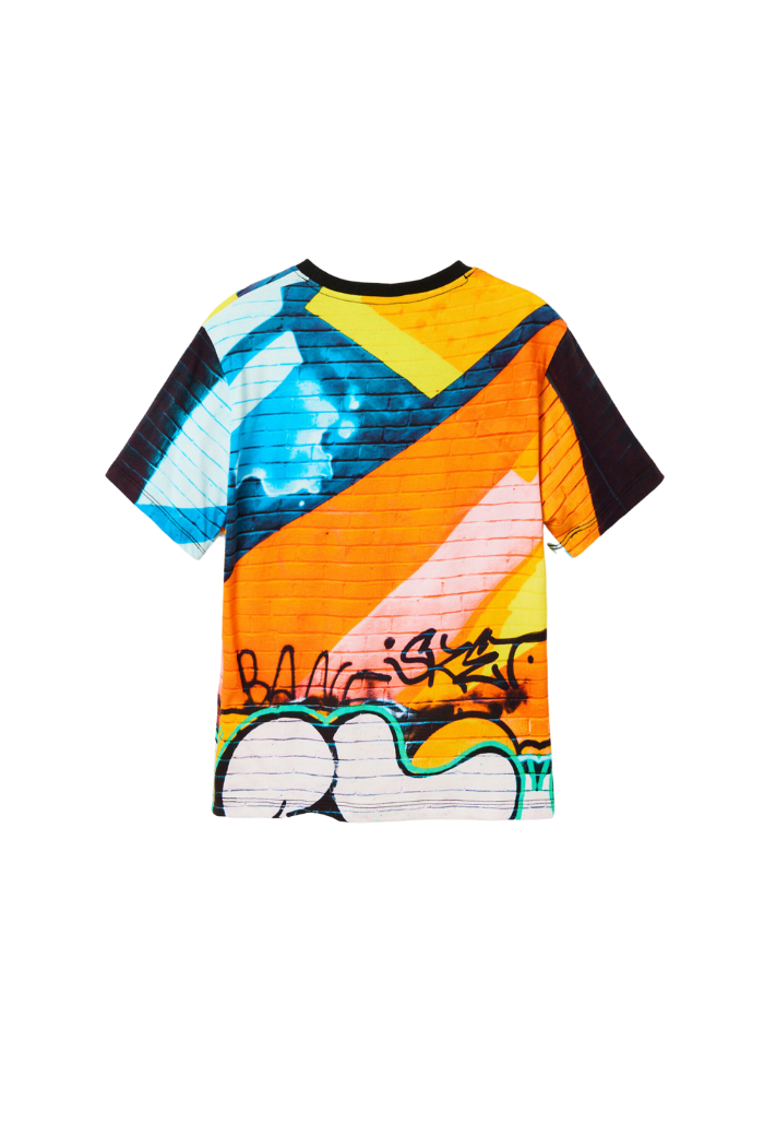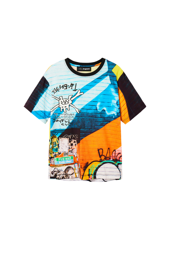 A short-sleeve T-shirt with a photographic graffiti print and textured detail.