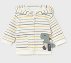 The Striped Dinosaur Hoodie combines playful design with practical comfort, featuring long sleeves and a cozy hooded collar for added warmth. Crafted on a white base accented with gray, yellow, tan, and green stripes, it offers a visually appealing, multi-colored pattern that captures attention. The standout dinosaur applique adds a charming, whimsical touch without compromising subtlety. Designed with functionality in mind, it includes a front central zip for easy wear and removal, alongside a convenient side pocket ideal for small essentials or keeping hands warm. Perfect for layering, this hoodie balances style and utility for everyday wear.