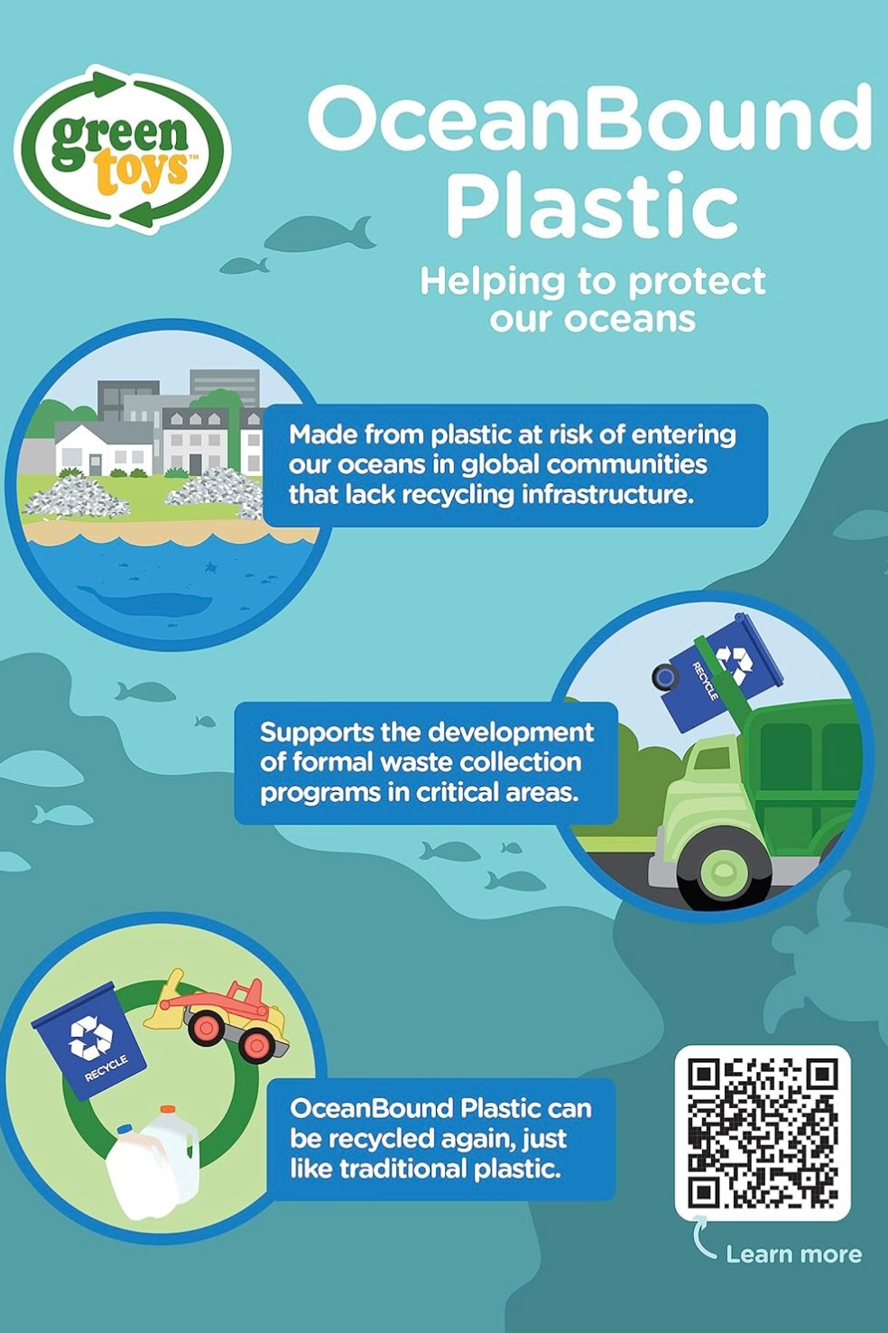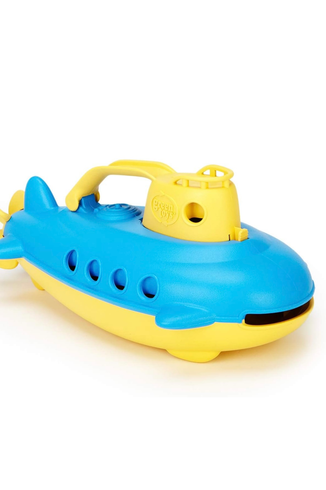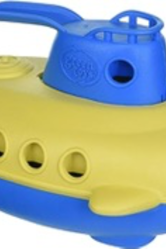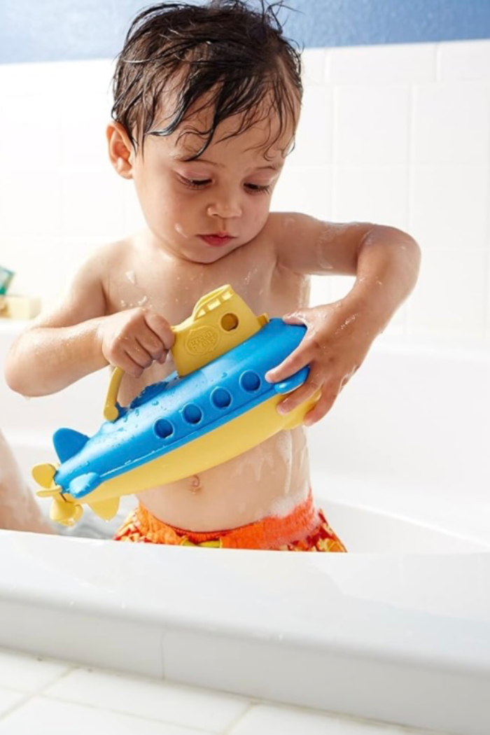 Green Toy bathtub toy in bright yellow and blue for 6 months and older.