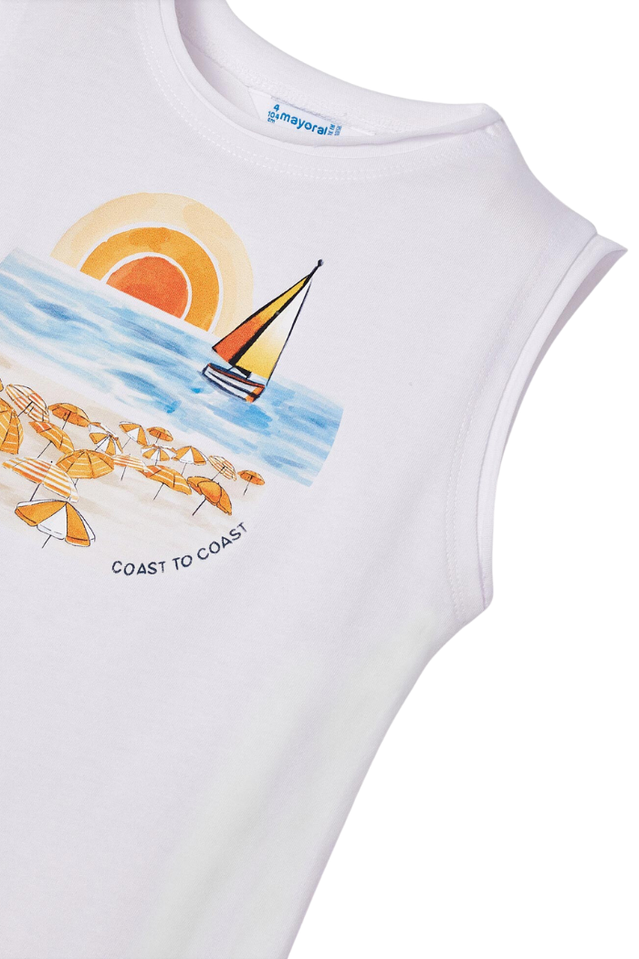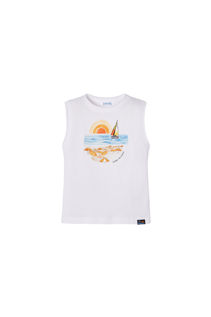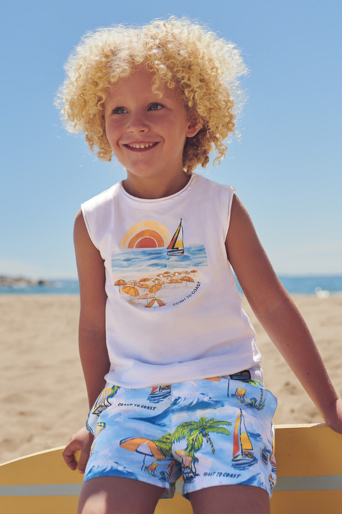 ECOFRIENDS garment 100% sustainable cotton. Sleeveless T-shirt for boy. Round neckline. Summer print.
