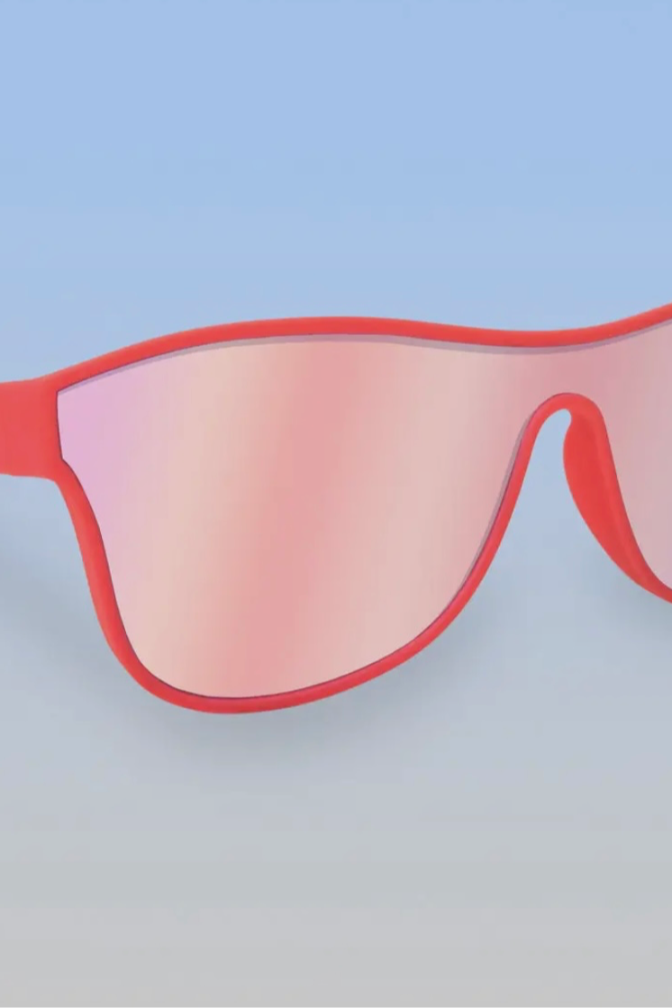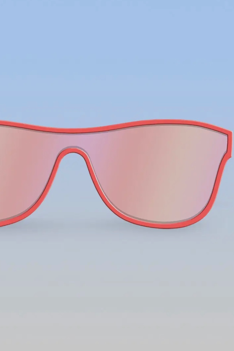 Roshambo's newest style of sunglasses melds super-neon, fun-spirited frame colors and mirrored polarized lenses for the coolest combos! Navy blue single shield sunglasses are available in sizes for Toddler through Adult Large (Giant).