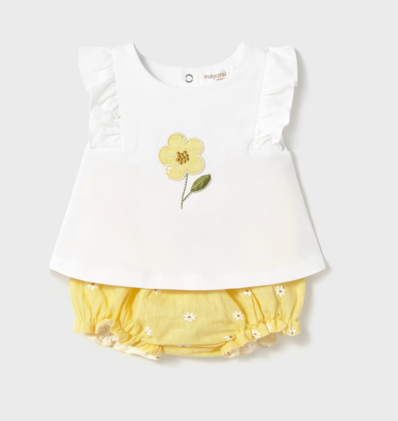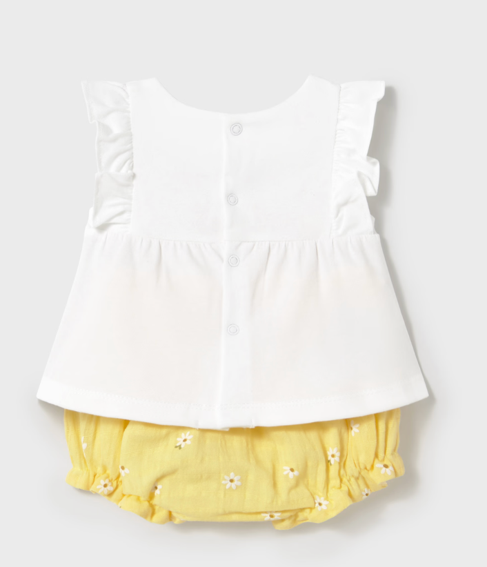 Introducing our Sunny Baby Bloomers and T-Shirt set, featuring a white ruffle sleeveless t-shirt with a beautiful yellow flower detail. Complete the look with our matching sunny yellow bloomers and daisy detailing.