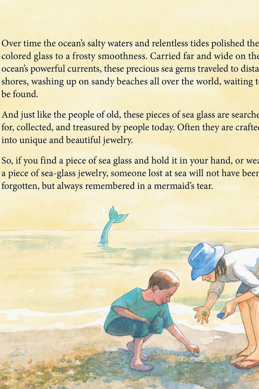 Long ago there was a time when men did not venture into the deep ocean waters. It was believed that the world was flat and to sail beyond the horizon meant falling off the edge of the earth. So even though they were fascinated by the ocean, men feared it. And as men lived their lives above the water, far beyond their view and in the ocean's deepest depths lived mysterious and magical sea creatures, half girl and half fish. These gentle creatures were called mermaids and much loved by the ocean. And when men overcame their fear and ventured out to sea, risking disaster, it was the mermaids who came to their rescue. This original legend explains the origin of sea glass, attributing it to the tears of mermaids, weeping for lives lost at sea.