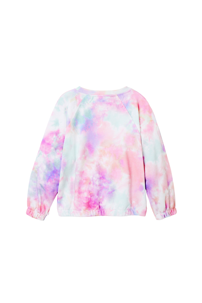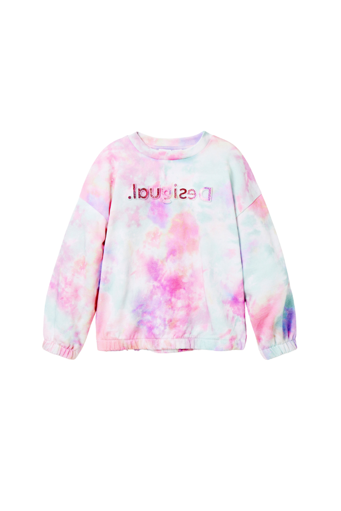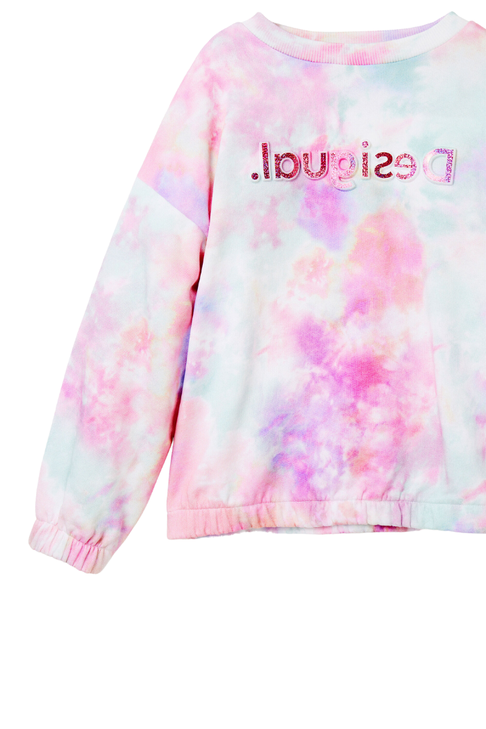 A sweatshirt with a tie-dye print and 3D-effect embossed glossy logo on the front.