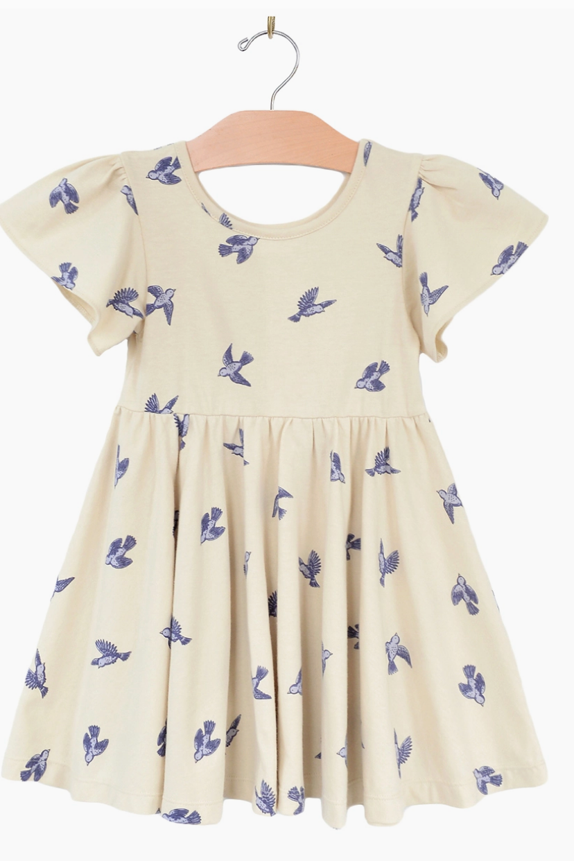 Made with the softest 100% combed cotton jersey. Featuring flowy sleeves, a soft elastic waist, and a flared bottom perfect for twirling. In our classic bluebird print, this dress is perfect to twirl from spring to summer!