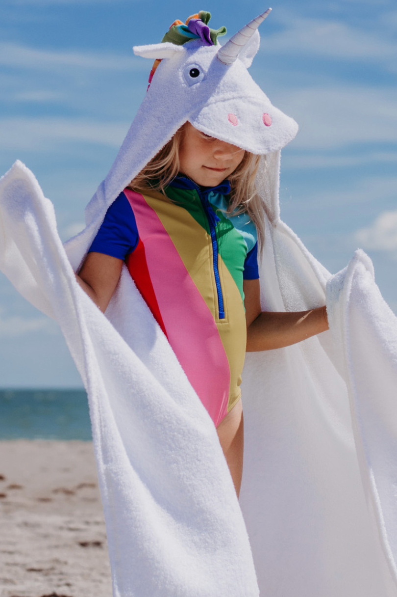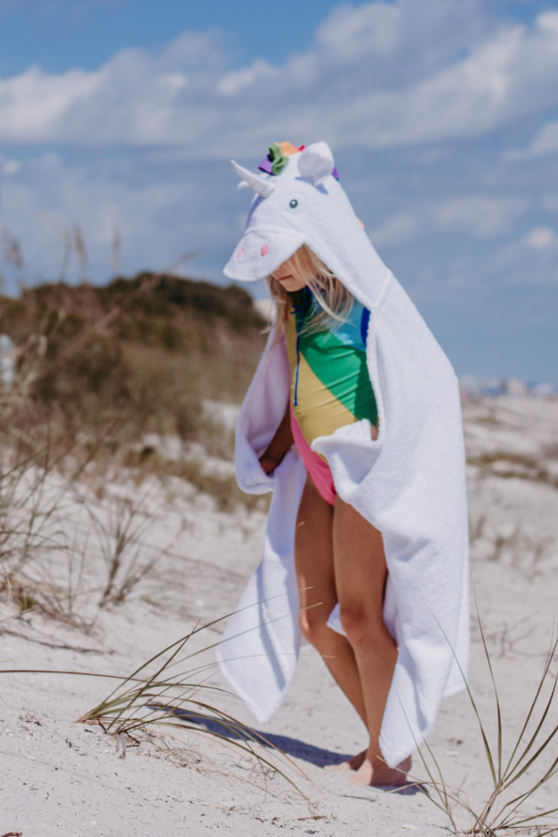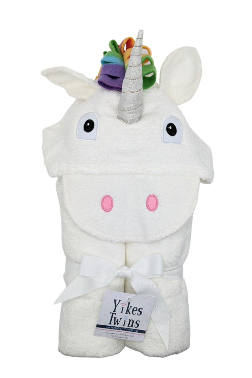 Introducing the Unicorn Yikes Twins Hooded Towel with Silver Rainbow Sparkle Horn!