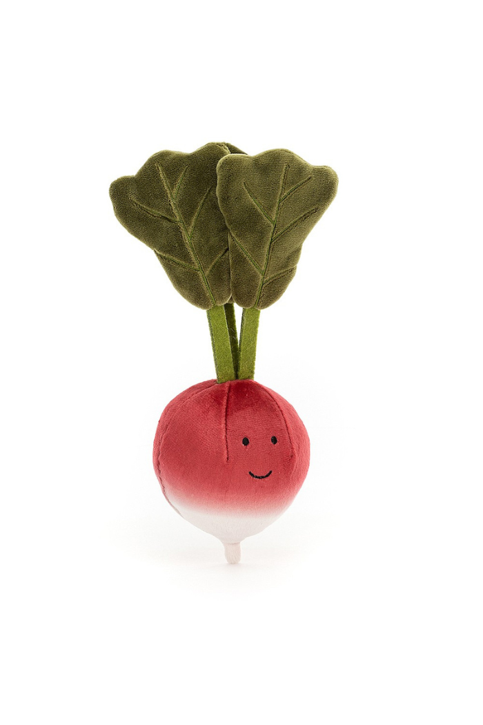 More stretchy than crunchy, Vivacious Radish is a most refreshing friend! Perky in pink-white ombre fur, with a plume of stitchy green velour leaves, this affable vegetable pops up to say hello! A kitchen mascot or goofy gift with the happiest smile in the salad drawer!