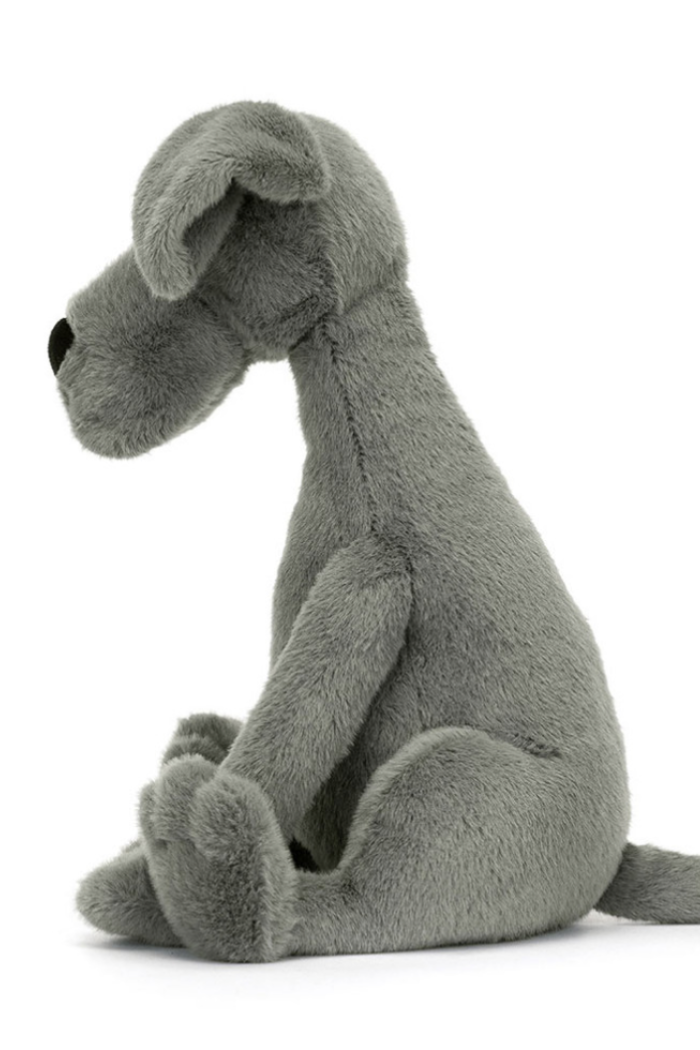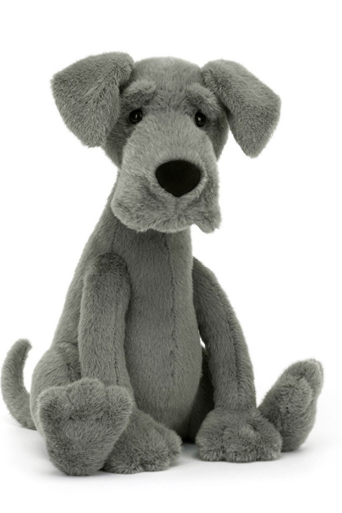 As mighty as his name, meet Zeus Great Dane! This leggy pup has blue-grey fur, standout brows and soft, floppy ears, with a huge black nose for sniffing out fun. Zeus has beautiful rumpled jowls, stitch-detail toes and a peaceful pose. A thoughtful dog with a loyal heart.